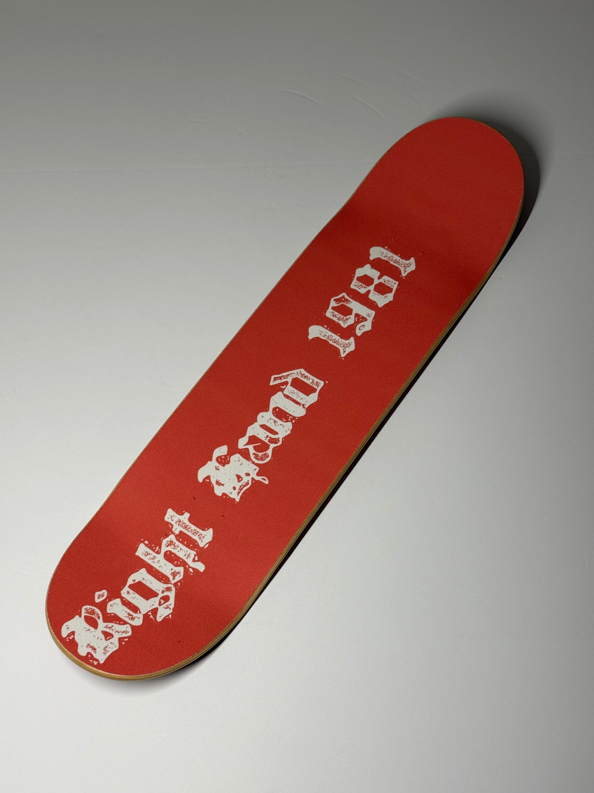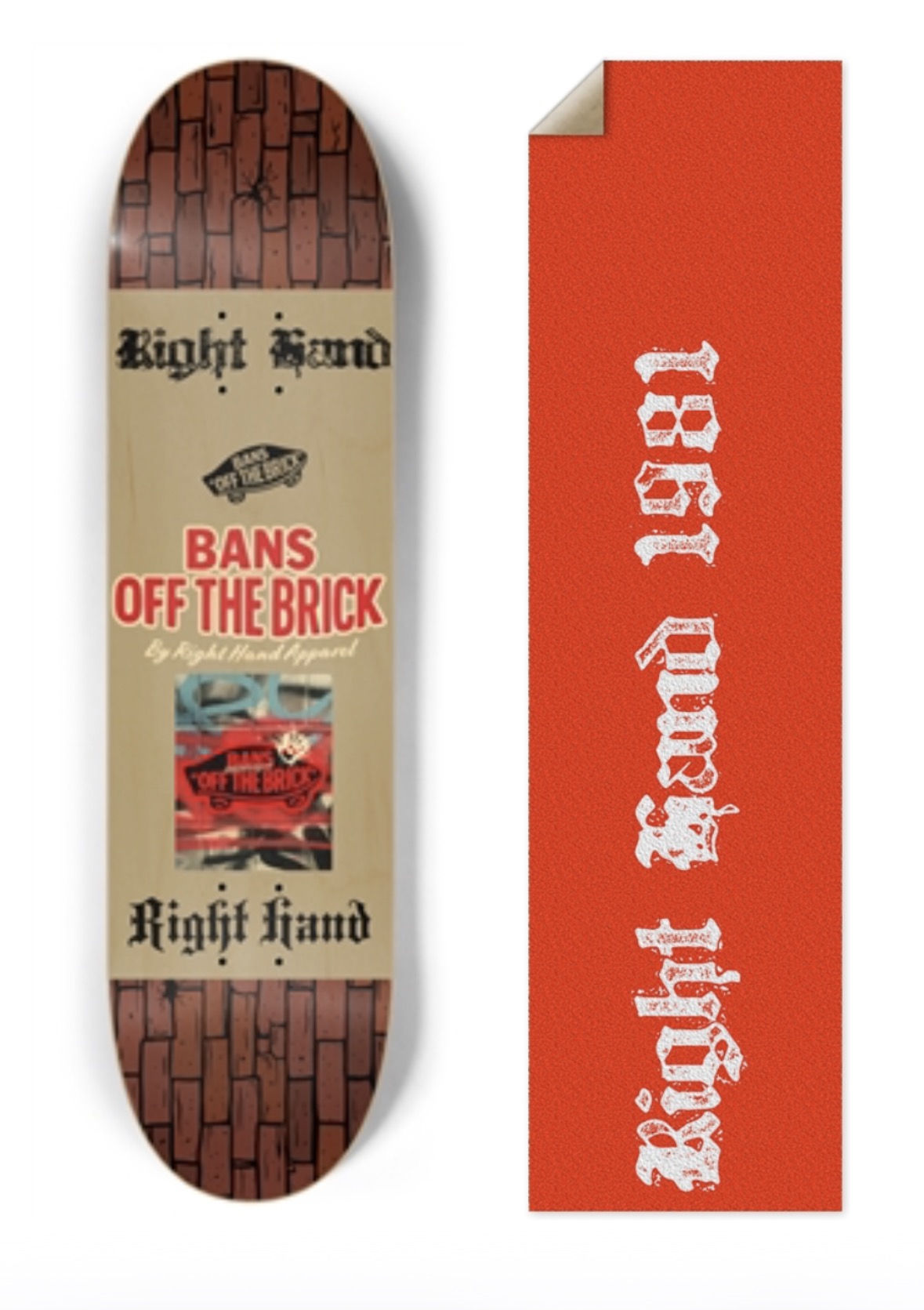 Custom Made Bans Off The Brick Graphic Skateboard With Custom Red Grip Tape. Designed By Right Hand Apparel.