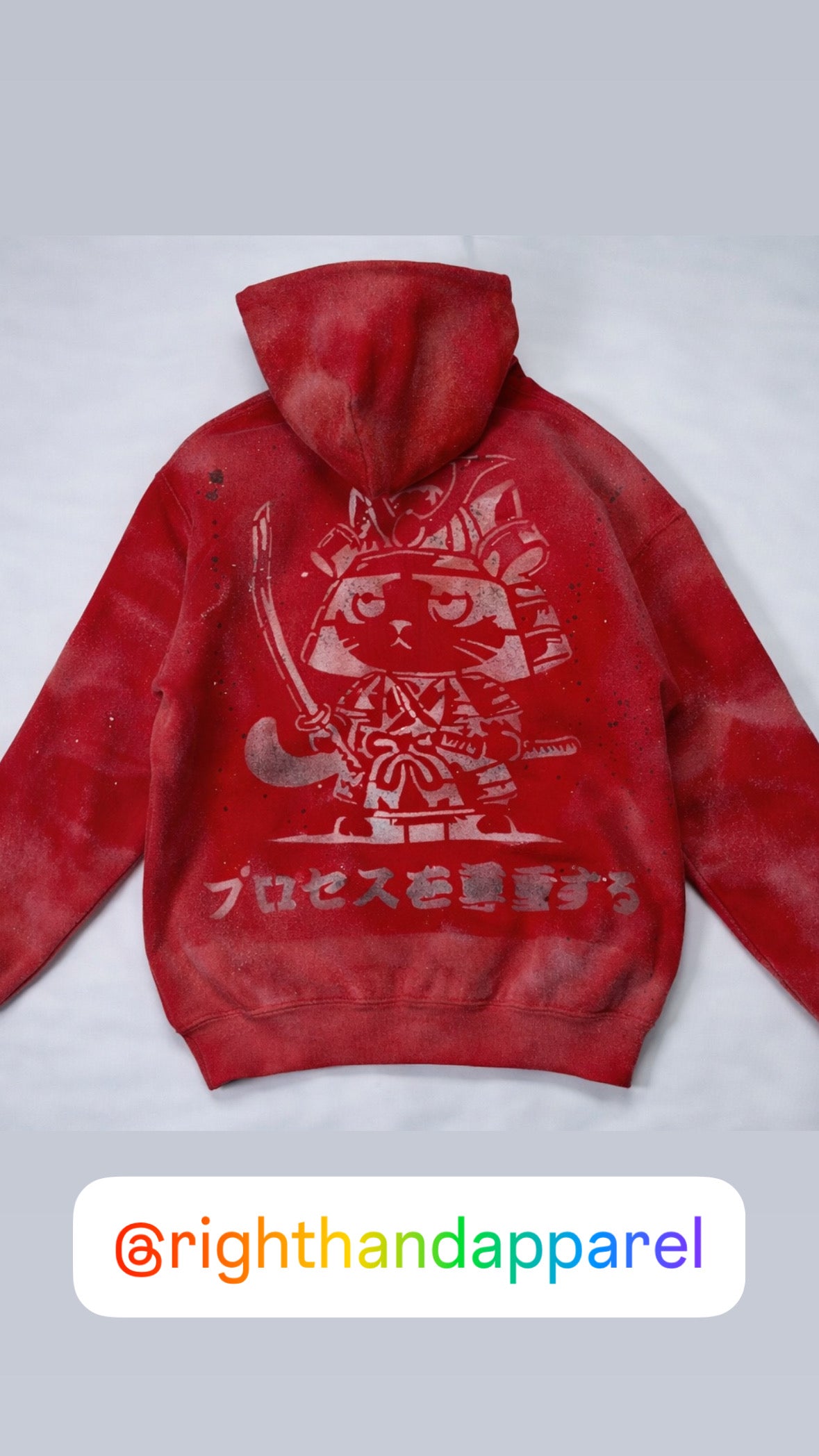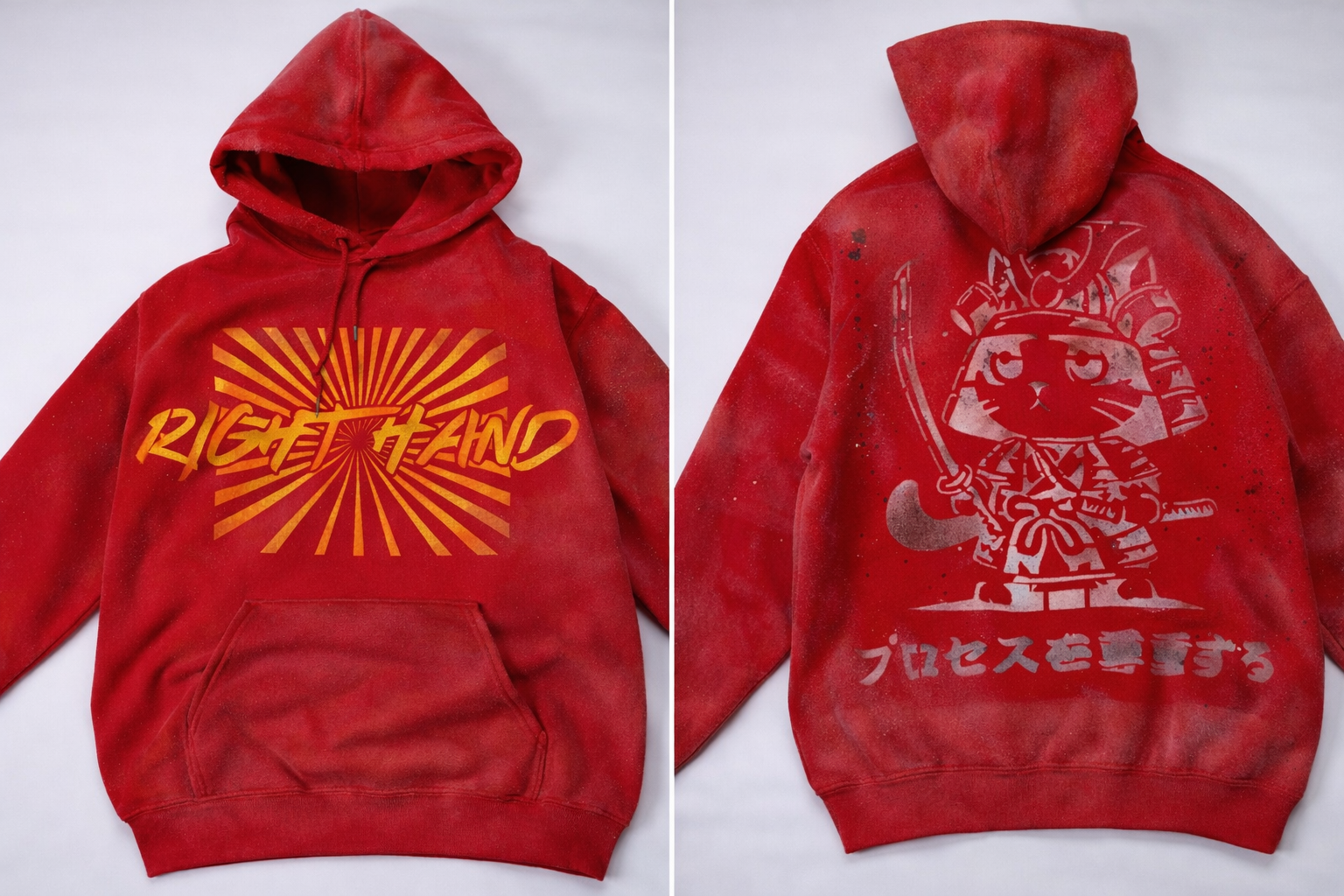 Handcrafted , distressed hoodie designed to stand out. Right Hand sunburst graphic on front and samurai inspired artwork on the back. This piece is individually treated making it truly one of a kind. Comfortable wear built for everyday.